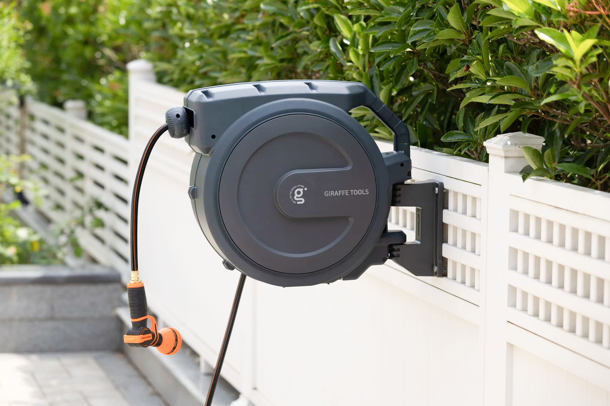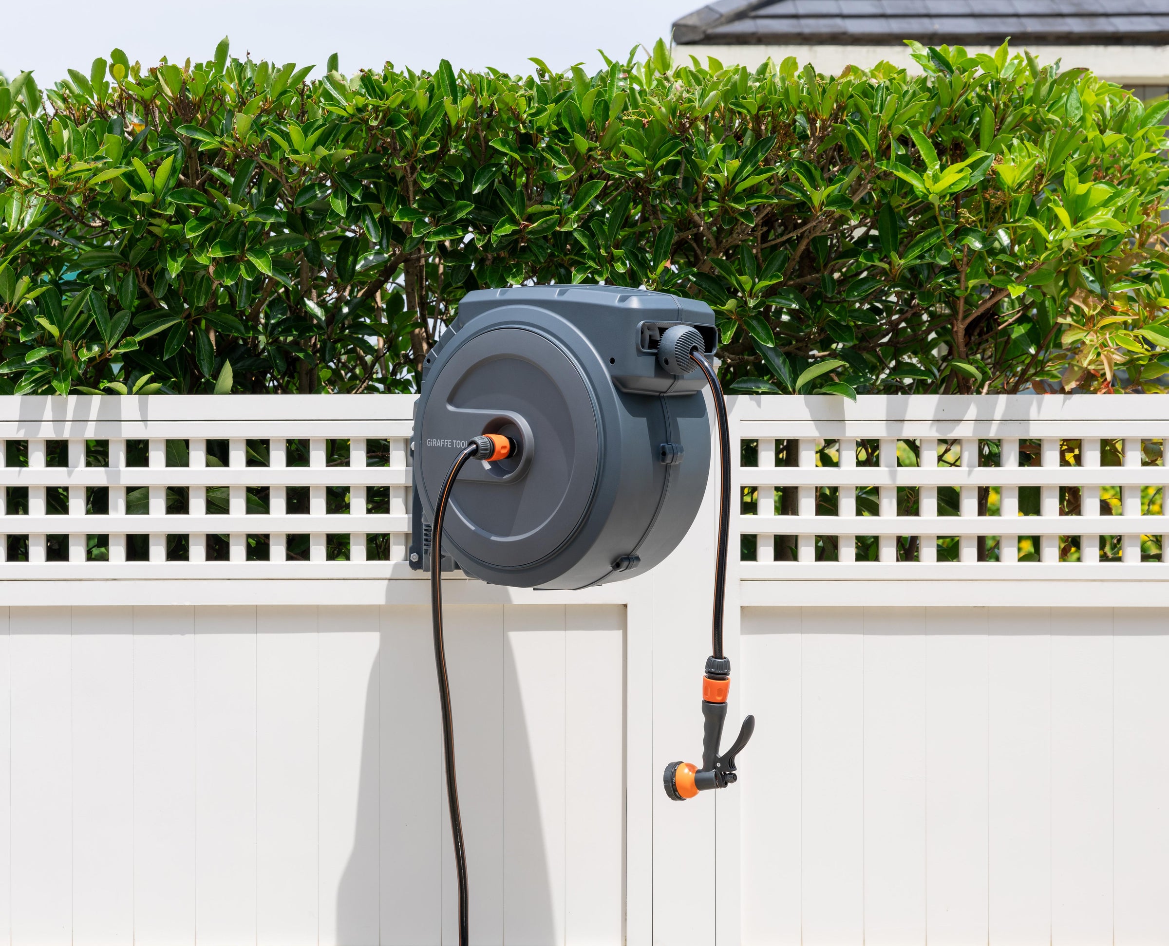 I've been trying out this amazing hose and reel from Giraffe Tools. No need to spend ages winding up or coiling up this hose. This does it for you. And it doesnt kink or tangle either. Simply attach to the wall. It has 180 degree rotational reach as well.