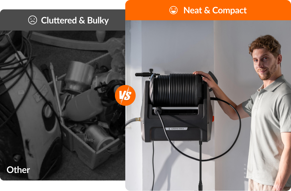 - Wall-Mounted, Fully Organized: Keep your space clean and clutter-free. The wall-mounted design lifts the unit off the ground, while built-in storage compartments hold the hose, spray gun, and nozzles—all in one place. Enjoy the sense of order!