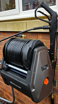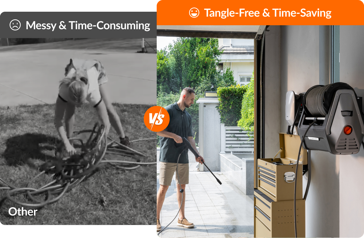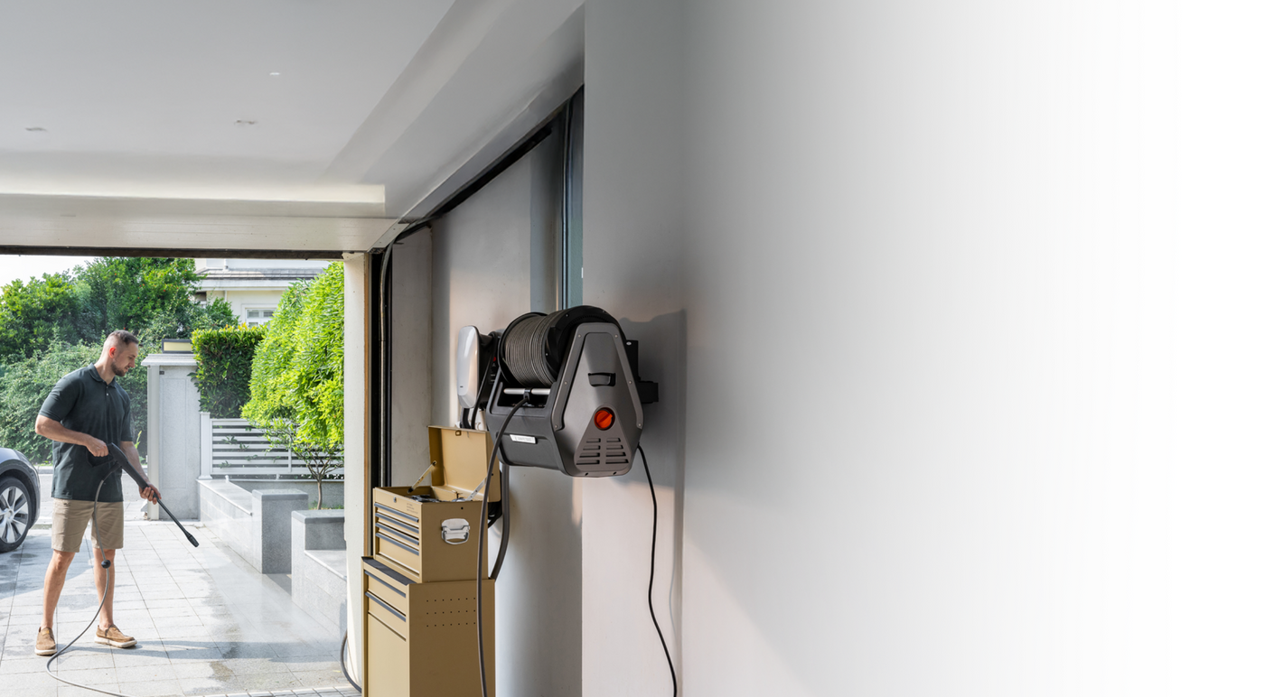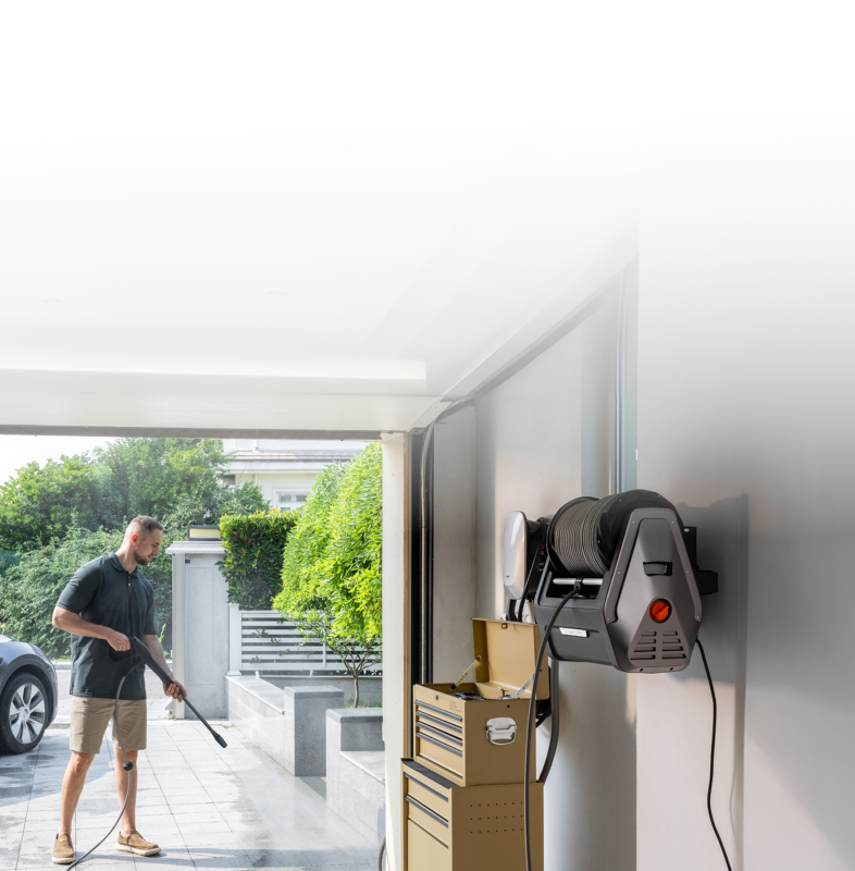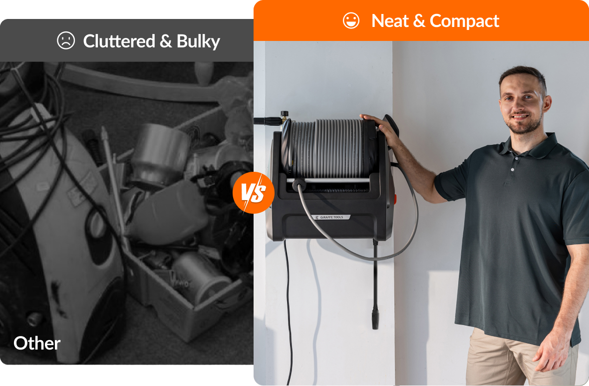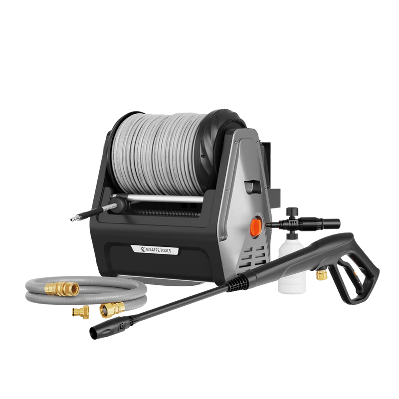 - Wall-Mounted & Organized: Designed to save space, the wall-mounted unit lifts off the ground while built-in compartments neatly store the hose, spray gun, and nozzles—all in one place for a clutter-free setup.